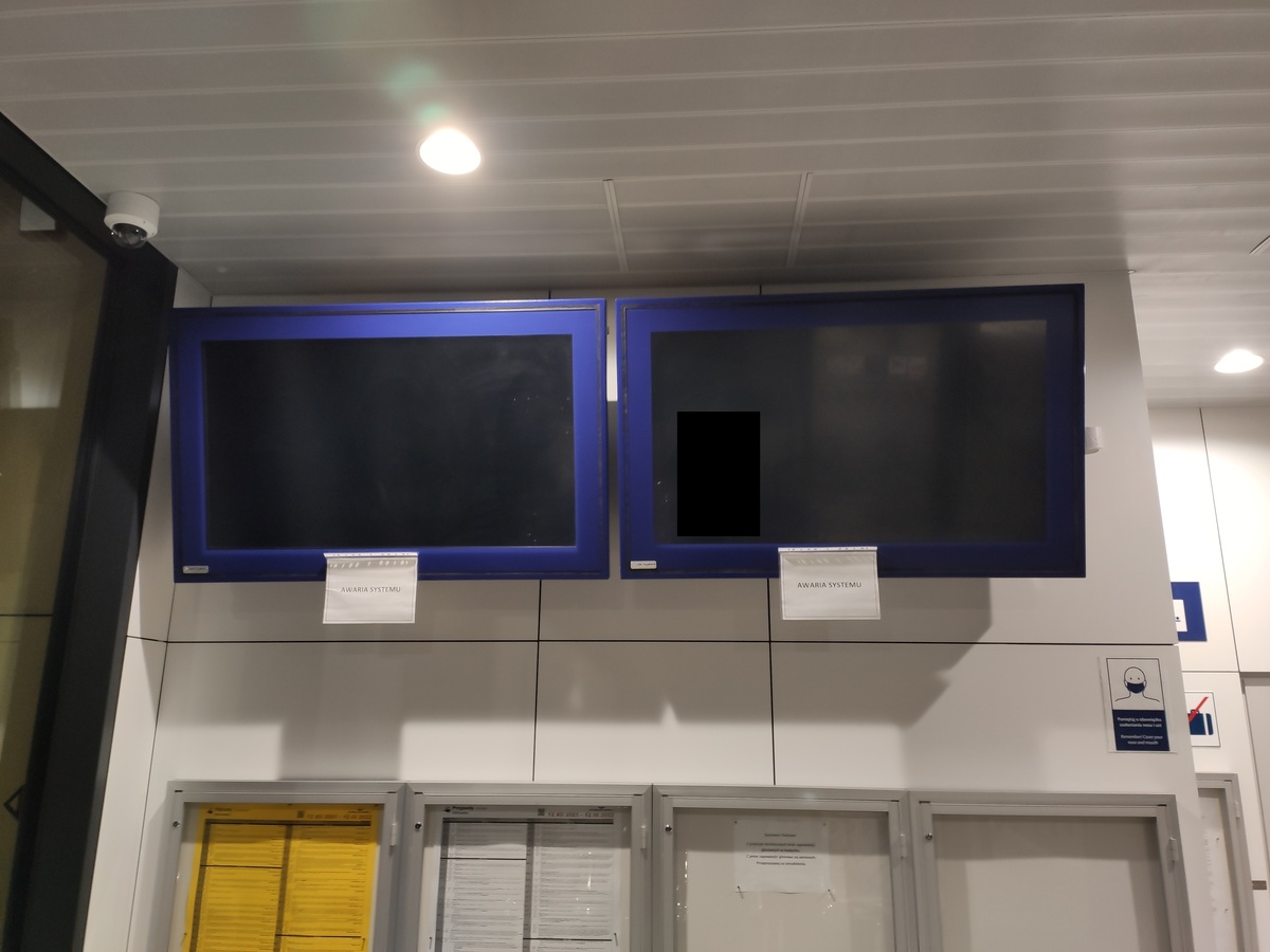 Niesprawności uległy wyświetlacze zbiorcze WZS – wyświetlające najbliższe odjazdy oraz przyjazdy pociągów, jak również zapowiedzi głosowe wewnątrz poczekalni.